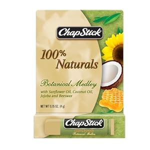 ChapStick 100% Naturals Botanical Medley moisturizes your lips with a special blend of natural ingredients including:Sunflower Oil, Coconut Oil, Jojaba BeeswaxChapStick 100% Naturals, a new line of 100% Natural Lip Balms