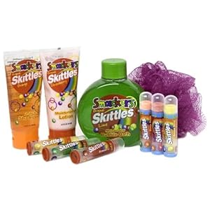A moisturizing bath and body collection in yummy Skittles candy scents from Smackers. Pamper yourself with a selection of Smackers bath and body products including lime bubble bath, strawberry. Moisturizing lotion, orange 2 - in - 1 shampoo, a bath puff and Lip Smacker. Skittles candy scents make bath time fun while gently cleansing and moisturizing.