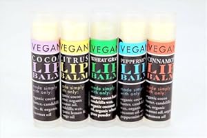 Read the full review. Vegan Lip Balm - 5 Pk Sticks - Assorted: Wheatgrass, Citrus, Peppermint, Cocoa & Cinnamon - Organic Healing Care For Dry, Cracked, Chapped & Sunburned Lips